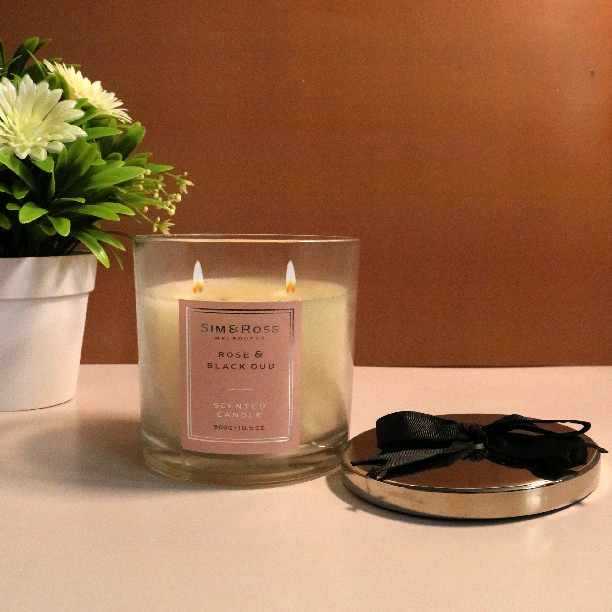 The Sim & Ross Rose & Black Oud Candle in 300g offers a sophisticated blend of delicate rose petals and the deep, smoky richness of black oud. This candle creates a captivating atmosphere with its rich, opulent fragrance, perfect for infusing your home with an aura of luxury and warmth.